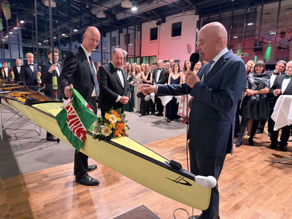 Begonnen hatte der Abend um 19:30 Uhr mit einem Sektempfang in der großzügigen Lobby des Festsaales. Sofort wurde die Gelegenheit zum Foto oder Porträt durch das Fotoatelier Kirsch rege genutzt. Der Keyboarder Aleksandr Kutnevic sorgte durch seine Melodien für eine entspannte Atmosphäre, wobei der Eyecatcher des Saales sicherlich der auf seine Taufe wartende neue Renn-Achter war, der in der Woche zuvor von der Werft Empacher aus Eberbach am Neckar nach Berlin-Neukölln überführt worden war.