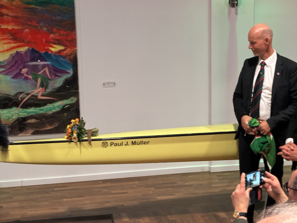 Es folgte dann kurz nach 21:00 Uhr die bereits von vielen erwartete Taufe des neuen Wikinger-Topschiffes, einem gelben Rennachter. Matthias Herrmann übernahm eine kurze Einführung in die Namensfindung. Dabei begrüßte er Herrn Thomas Müller, der als ehemaliger geschäftsführender Gesellschafter der Vereinigten Spezialmöbelfabriken die Taufe vornahm und das Boot unter großem Beifall auf den Namen seines Großvaters und Mitbegründers des WIKING, P. Johannes Müller, taufte. Dabei zerschellte das Sektglas unter dem wuchtigen Schlag auf den Bugnummernhalter in tausende kleine Scherben.