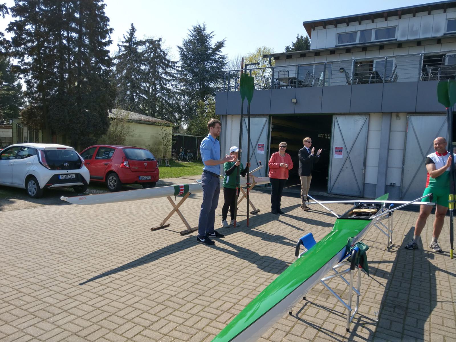 Im Anschluss konnten zwei neue Einer getauft werden. Auf den Namen "Quick" wurde der bei "Quer durch Berlin" gewonnene Kindereiner getauft. Dies übernahm die Neuköllner Bezirksstadträtin für Bildung, Schule, Kultur und Sport Karin Korte. Der neue Einer für den Allgemeinen Ruderbetrieb heißt nun "Bydgoszcz" und unterstreicht die Freundschaft zwischen der RG Wiking und dem in der polnischen Stadt Bydgoszcz beheimateten Ruderverein Lotto Bydgostia. Eine Delegation aus Bydgoszcz um die stellv. Vorsitzende Anna Tataruch und den Trainer Leszek Lemańczyk war extra nach Berlin gereist, um die Taufe vorzunehmen. Zum Zeichen der Freundschaft überreichten sie zudem eine schöne Trophäe an Jan Bredemeyer, der die Taufzeremonien mit Witz, Charme und dem nötigen Ernst moderierte und insbesondere die grenzüberschreitende und verbindende Kraft, die den Rudersport im Besonderen und den Sport im Allgemeinen auszeichnet, hervorhob.