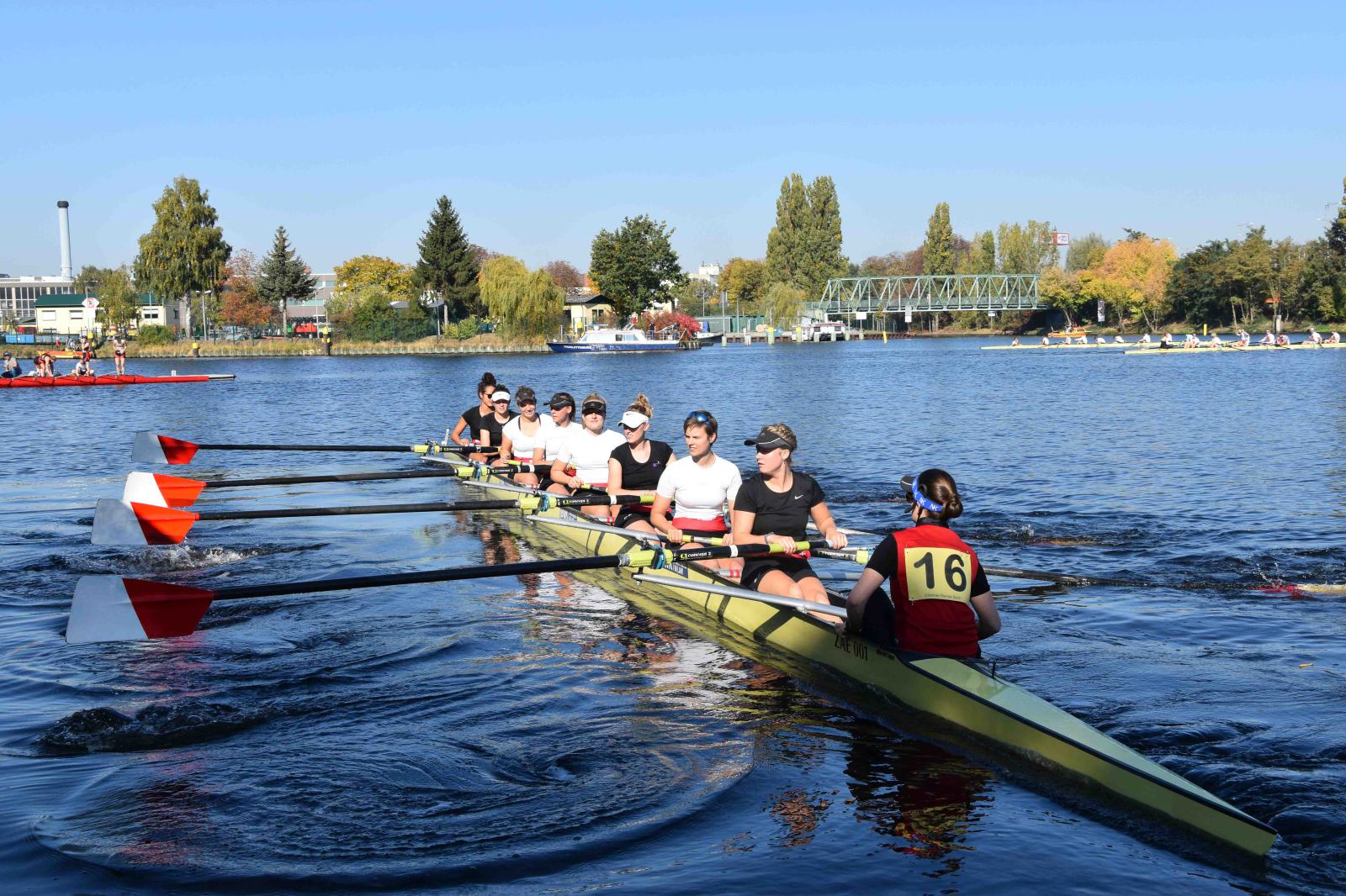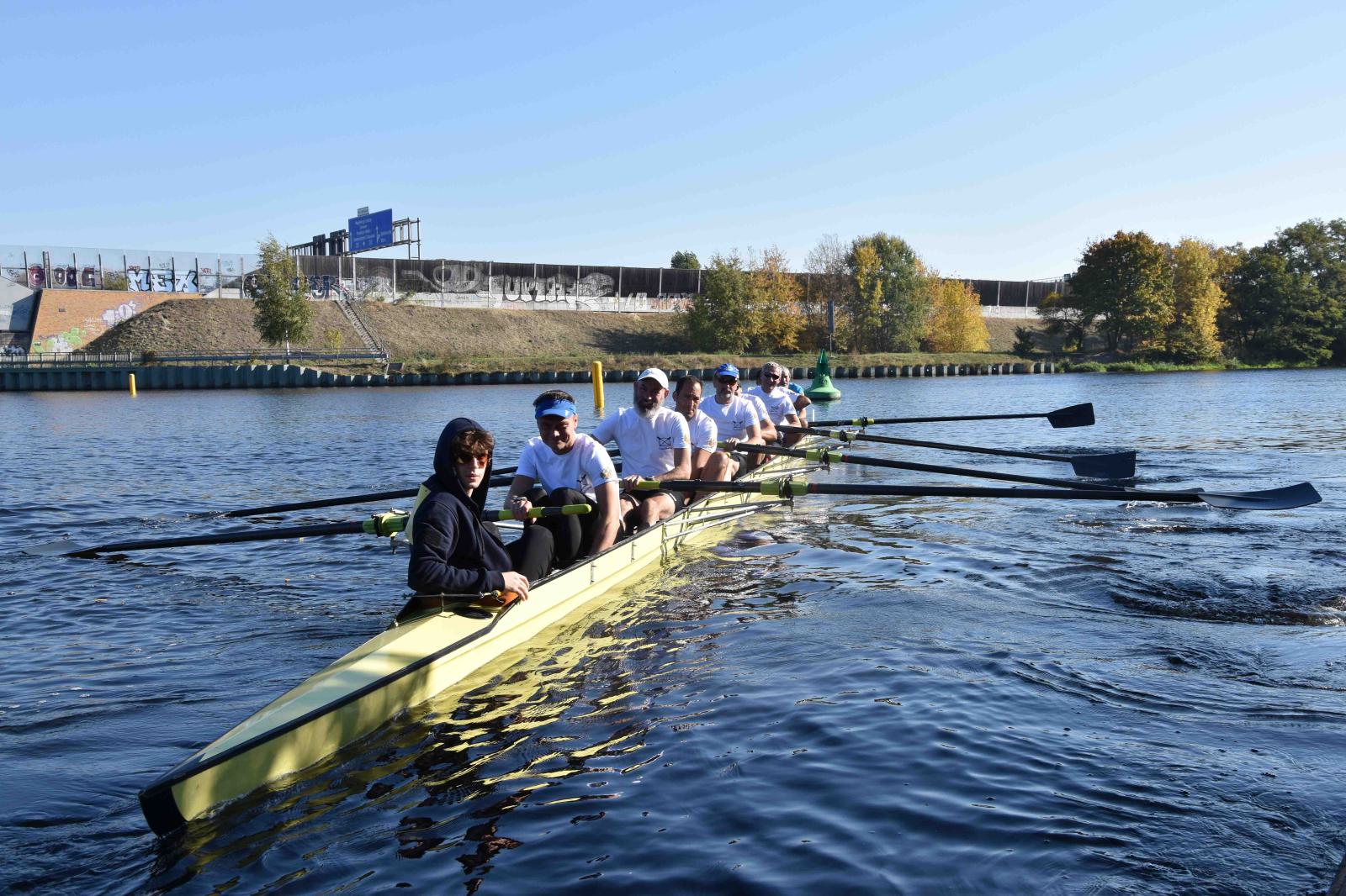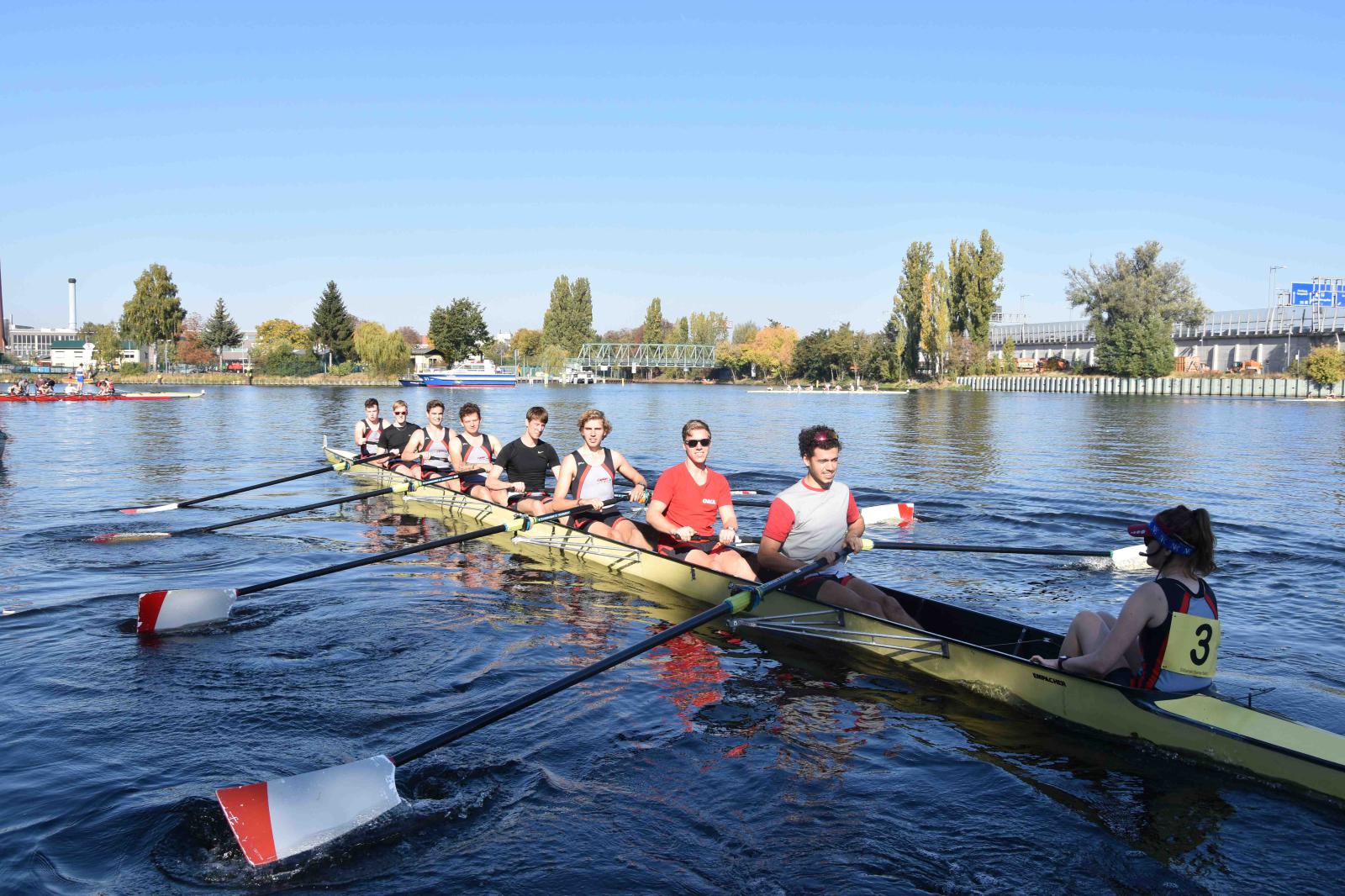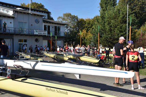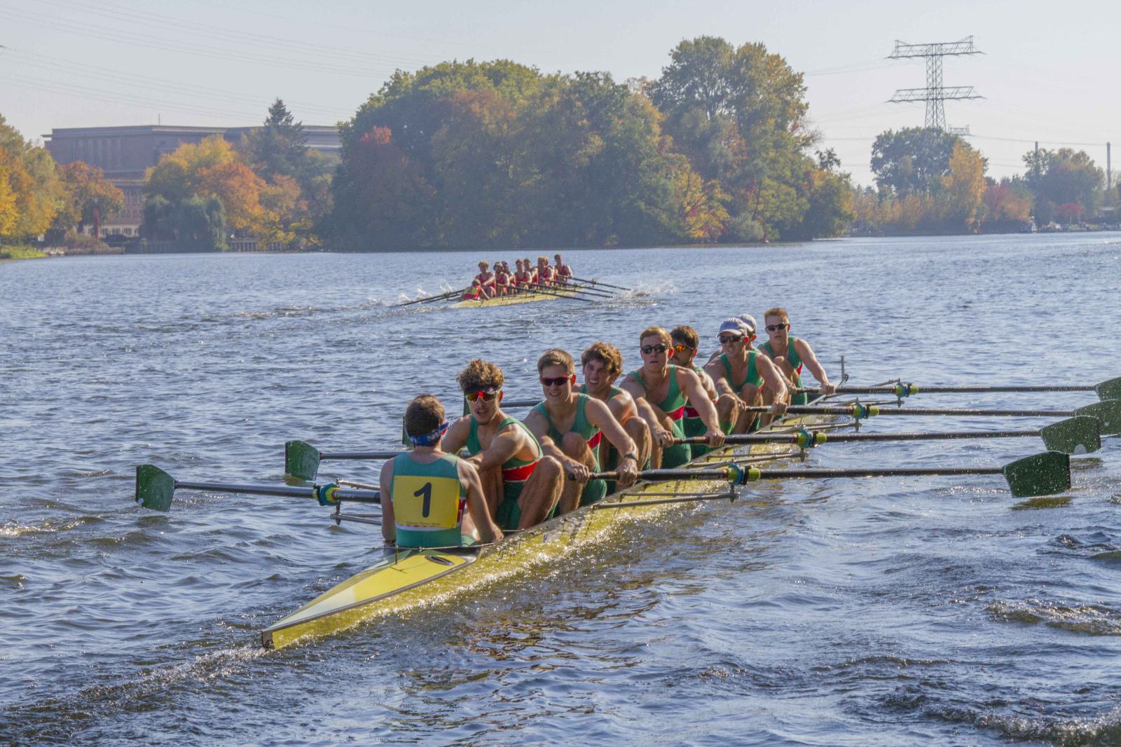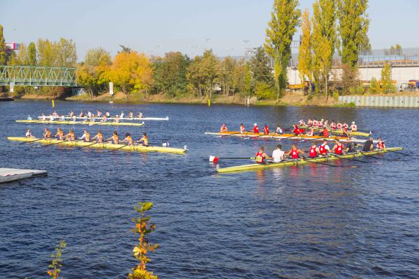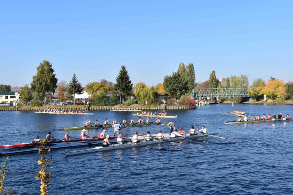 Mit warm anziehen war auch am Samstag für die Ruderer nix. Bei supersonnigem Herbstwetter ging es zunächst um den Sieg auf der langen klassischen Distanz über 6,3 km. Dabei ging es von der Spreeinsel der Jugend entlang an der ehemaligen Berliner Mauer bis zum Britzer Hafen in Neukölln. An den Start gingen 22 Achtermannschaften, 7 Frauen Doppelvierer und 6 Gigdoppelvierer in der Club- und Inklussionsklasse. Dabei tankten Ruderer und Zuschauer zwischen Treptow und Neukölln mit viel nackter Haut die vermeintlich letzten Sonnenstrahlen im Oktober.