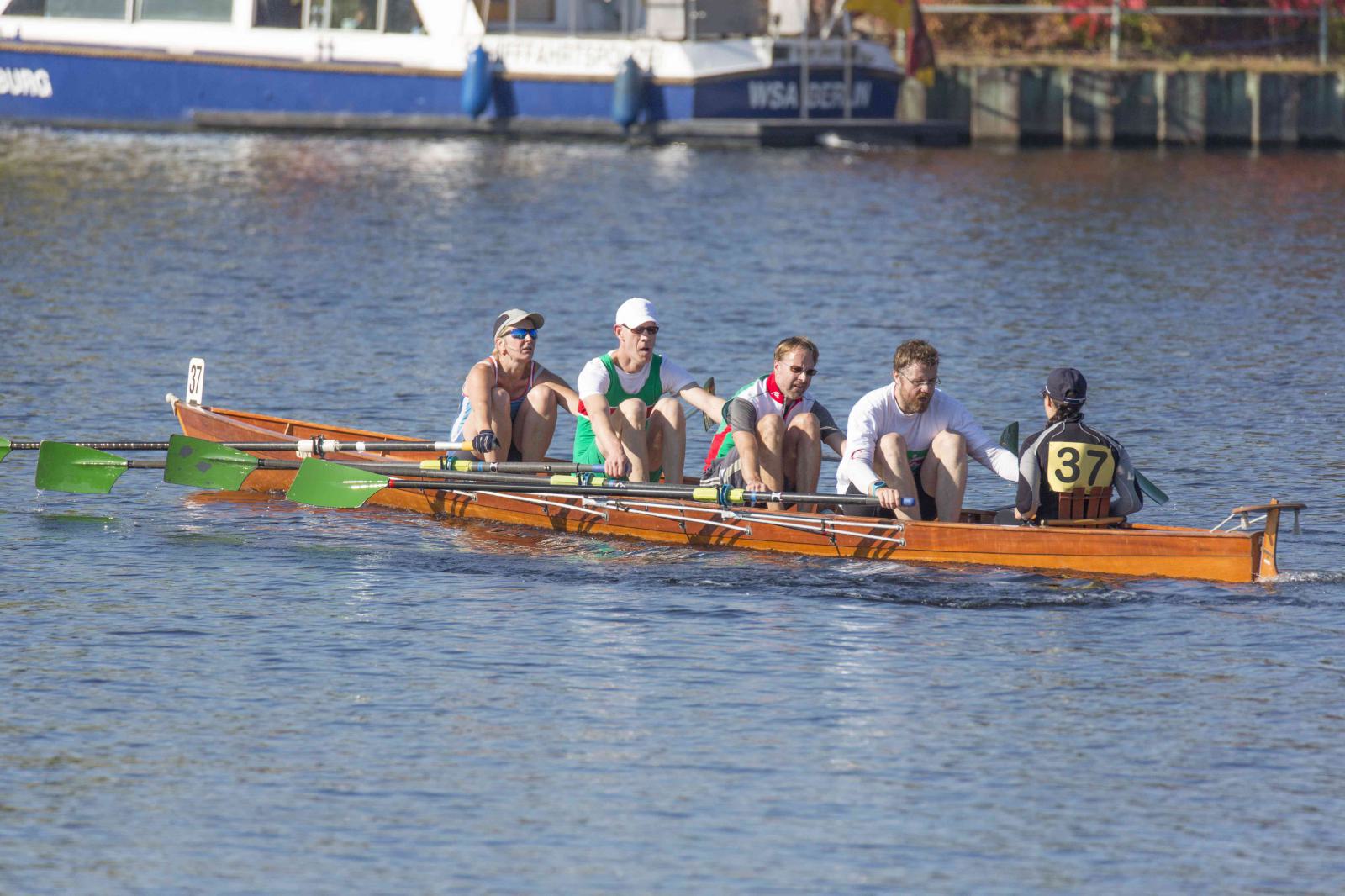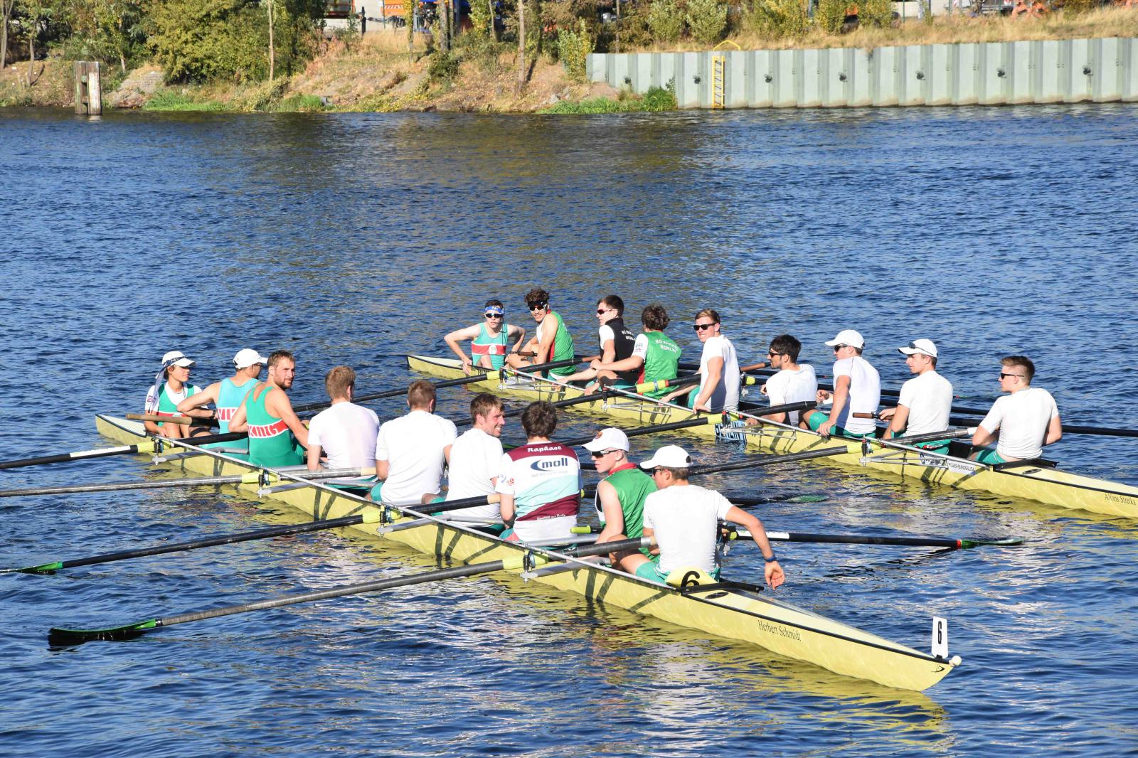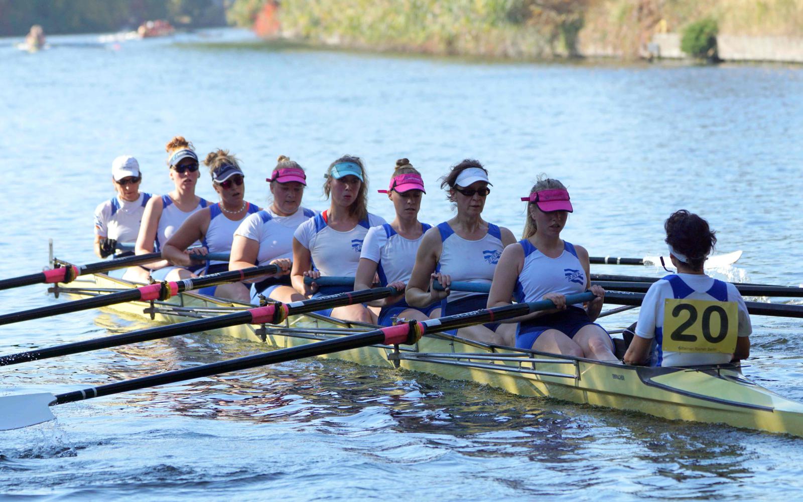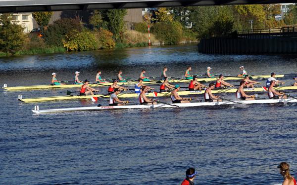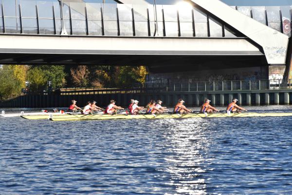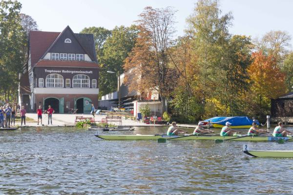 Mit warm anziehen war auch am Samstag für die Ruderer nix. Bei supersonnigem Herbstwetter ging es zunächst um den Sieg auf der langen klassischen Distanz über 6,3 km. Dabei ging es von der Spreeinsel der Jugend entlang an der ehemaligen Berliner Mauer bis zum Britzer Hafen in Neukölln. An den Start gingen 22 Achtermannschaften, 7 Frauen Doppelvierer und 6 Gigdoppelvierer in der Club- und Inklussionsklasse. Dabei tankten Ruderer und Zuschauer zwischen Treptow und Neukölln mit viel nackter Haut die vermeintlich letzten Sonnenstrahlen im Oktober.