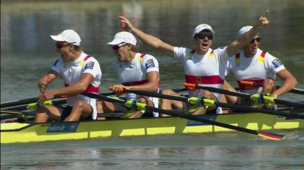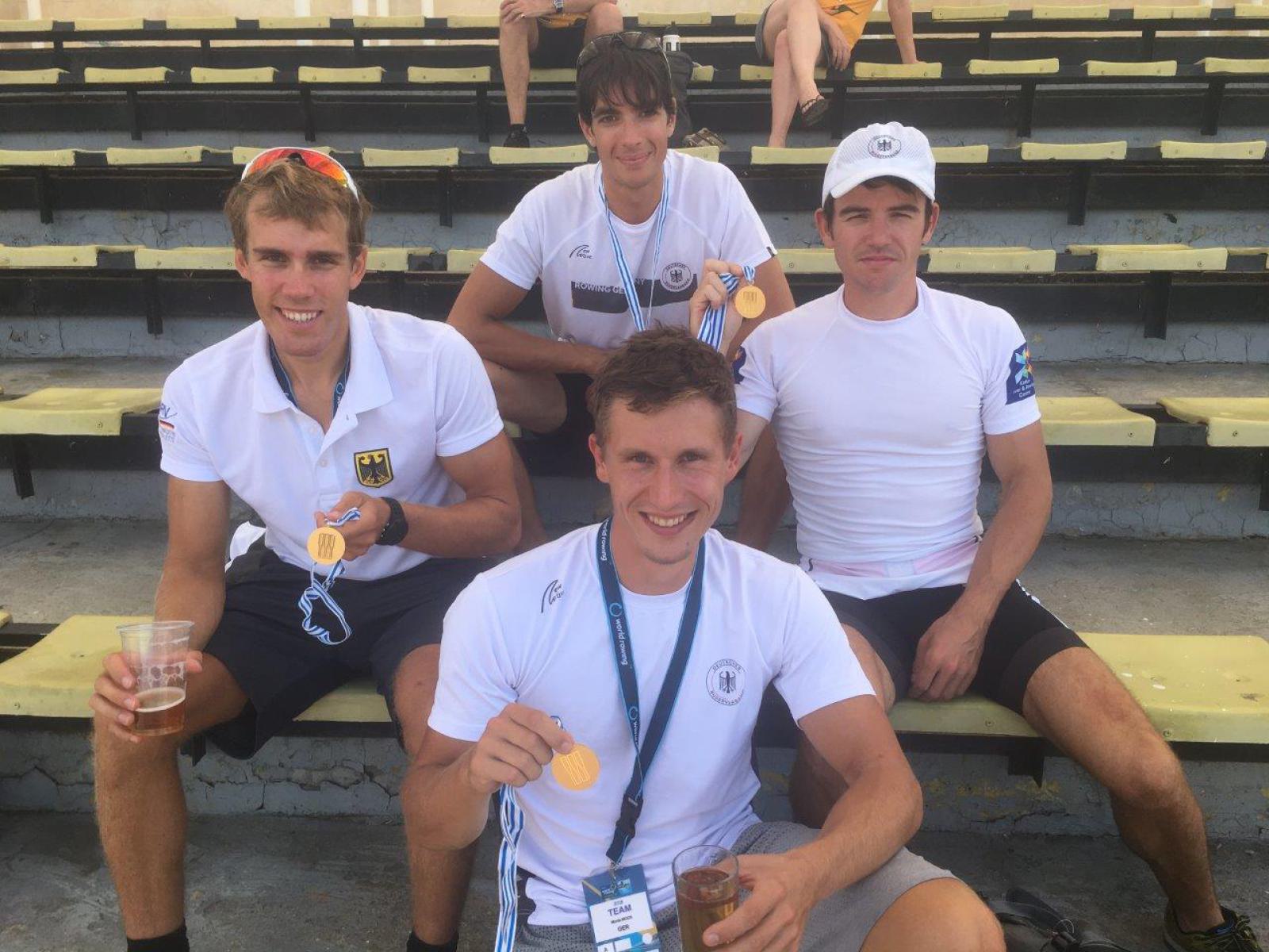 Das von Robert Sens trainierte Boot mit Schlagmann Moritz Moos, Florian Roller, Max und Bugmann Joachim Agne überraschte die favorisierten Italiener mit einem super Start und setzten sich früh an die Spitze des Feldes. Anschließend fuhren der deutsche und italiensche Doppelvierer nahezu Bugball an Bugball über die mittleren 1000m. 500m vor dem Ziel kam dann der entscheidende Angriff aus dem DRV-Boot, bei dem sich die deutschen Männer entscheidend absetzen und dem Weltmeistertitel entgegen rudern konnten.