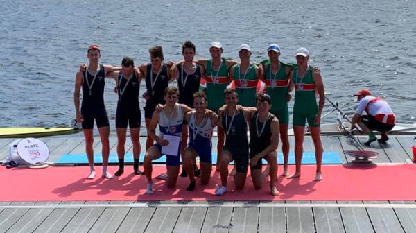 Die erste Medaillenentscheidung gab es dann im Leichtgewichts 4-. Mirko, Béla, Jesper und Marcel kamen gut in das Rennen rein, mussten aber bei zunehmendem Wind die ersten beiden Boote etwas ziehen lassen. Der gewohnt gute Endspurt verhalf dem Vierer aber zur Bronzemedaille, die mit nur 35 Hundertstel Rückstand sogar fast noch versilbert worden wäre.