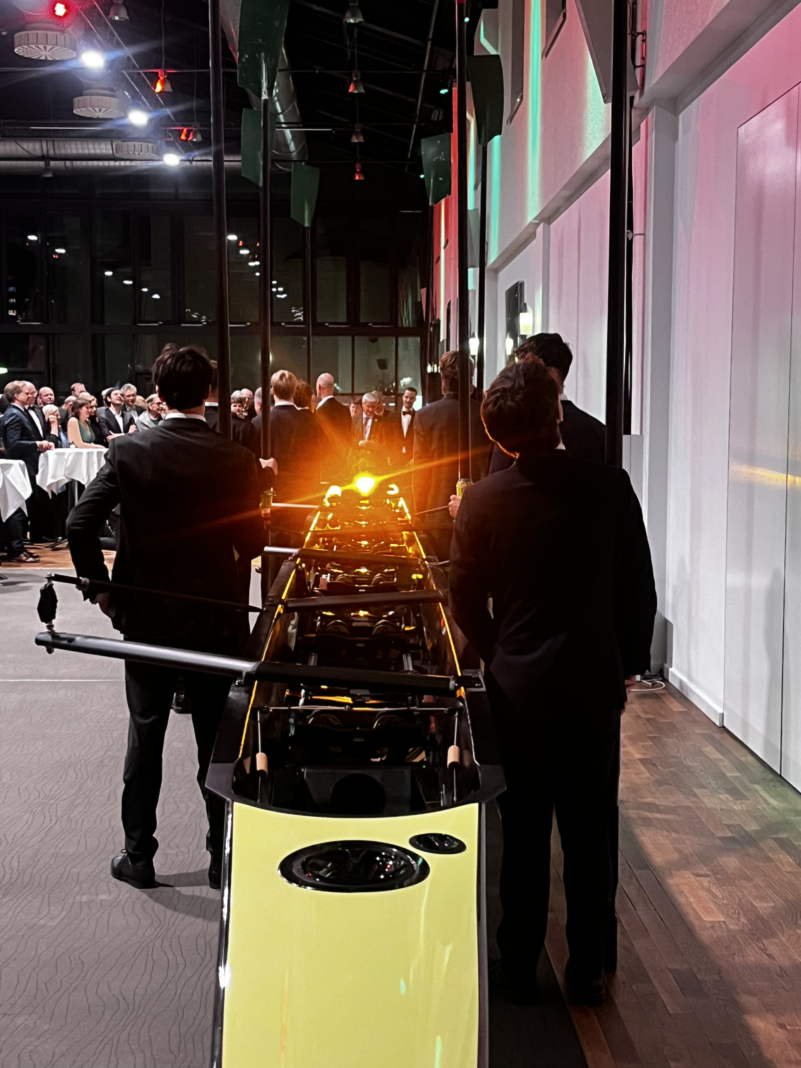 Begonnen hatte der Abend um 19:30 Uhr mit einem Sektempfang in der großzügigen Lobby des Festsaales. Sofort wurde die Gelegenheit zum Foto oder Porträt durch das Fotoatelier Kirsch rege genutzt. Der Keyboarder Aleksandr Kutnevic sorgte durch seine Melodien für eine entspannte Atmosphäre, wobei der Eyecatcher des Saales sicherlich der auf seine Taufe wartende neue Renn-Achter war, der in der Woche zuvor von der Werft Empacher aus Eberbach am Neckar nach Berlin-Neukölln überführt worden war.