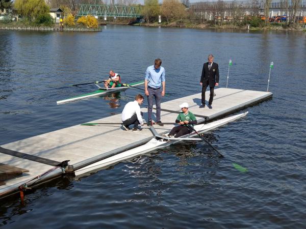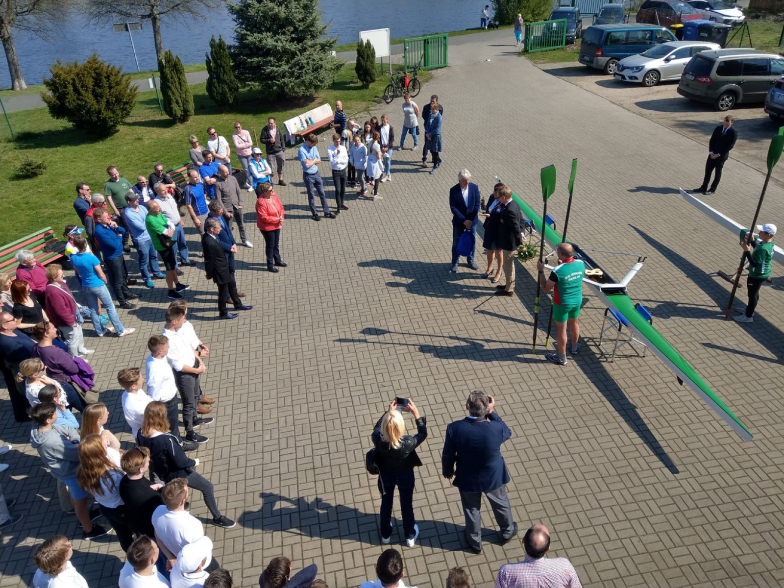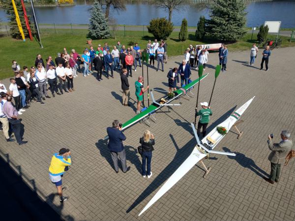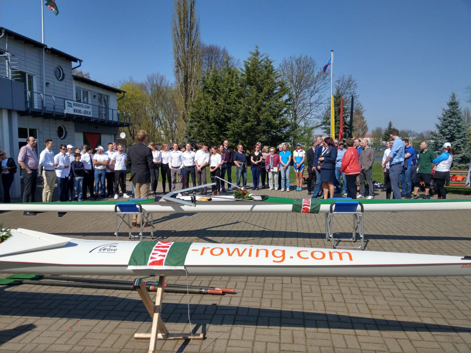 Im Anschluss konnten zwei neue Einer getauft werden. Auf den Namen "Quick" wurde der bei "Quer durch Berlin" gewonnene Kindereiner getauft. Dies übernahm die Neuköllner Bezirksstadträtin für Bildung, Schule, Kultur und Sport Karin Korte. Der neue Einer für den Allgemeinen Ruderbetrieb heißt nun "Bydgoszcz" und unterstreicht die Freundschaft zwischen der RG Wiking und dem in der polnischen Stadt Bydgoszcz beheimateten Ruderverein Lotto Bydgostia. Eine Delegation aus Bydgoszcz um die stellv. Vorsitzende Anna Tataruch und den Trainer Leszek Lemańczyk war extra nach Berlin gereist, um die Taufe vorzunehmen. Zum Zeichen der Freundschaft überreichten sie zudem eine schöne Trophäe an Jan Bredemeyer, der die Taufzeremonien mit Witz, Charme und dem nötigen Ernst moderierte und insbesondere die grenzüberschreitende und verbindende Kraft, die den Rudersport im Besonderen und den Sport im Allgemeinen auszeichnet, hervorhob.