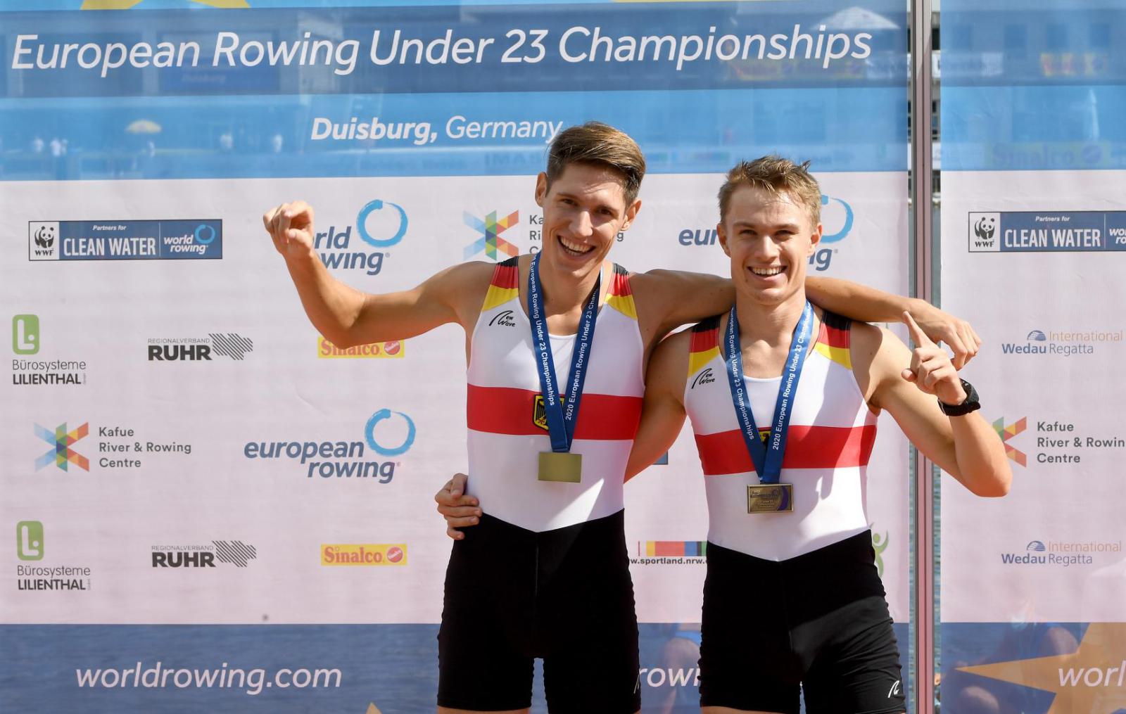 Unsere beiden Ruderer Marcel Gallien und Mirko Rahn haben heute bei den U23-Europameisterschaften auf der Regattabahn im Sportpark Duisburg den dritten Platz und damit die Bronzemedaille im Leichtgewichts-Zweier gewonnen. In einem tollen Rennen verbesserten sie ihre Leistungen aus Vor- und Hoffnungslauf um 15 Sekunden und mussten sich nur den überlegenen Italienern und in einem harten Kampf dem portugiesischen Boot geschlagen geben! Wir gratulieren den beiden Wikingern und ihrem Trainer Martin Hasse zu diesem großartigen Erfolg!