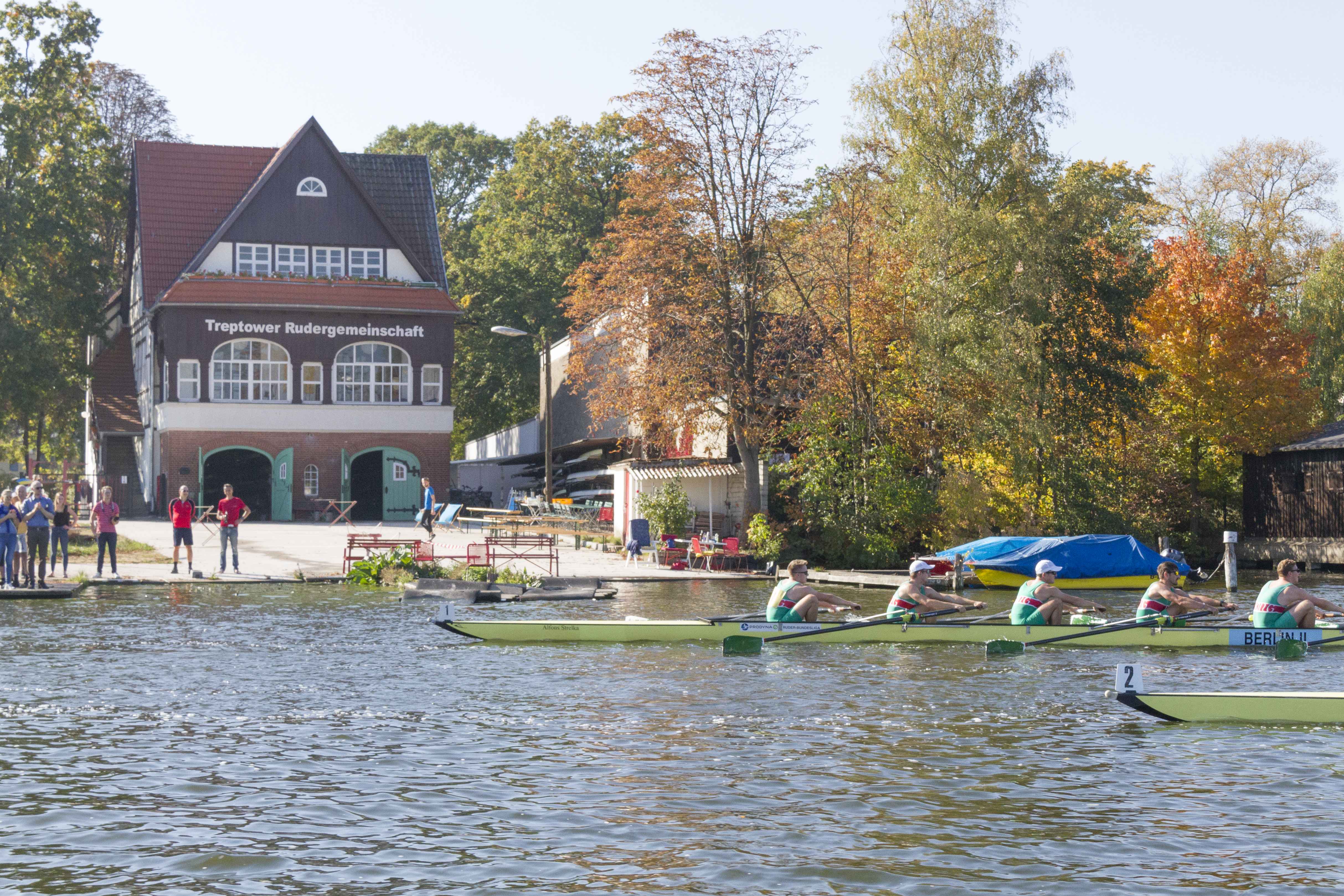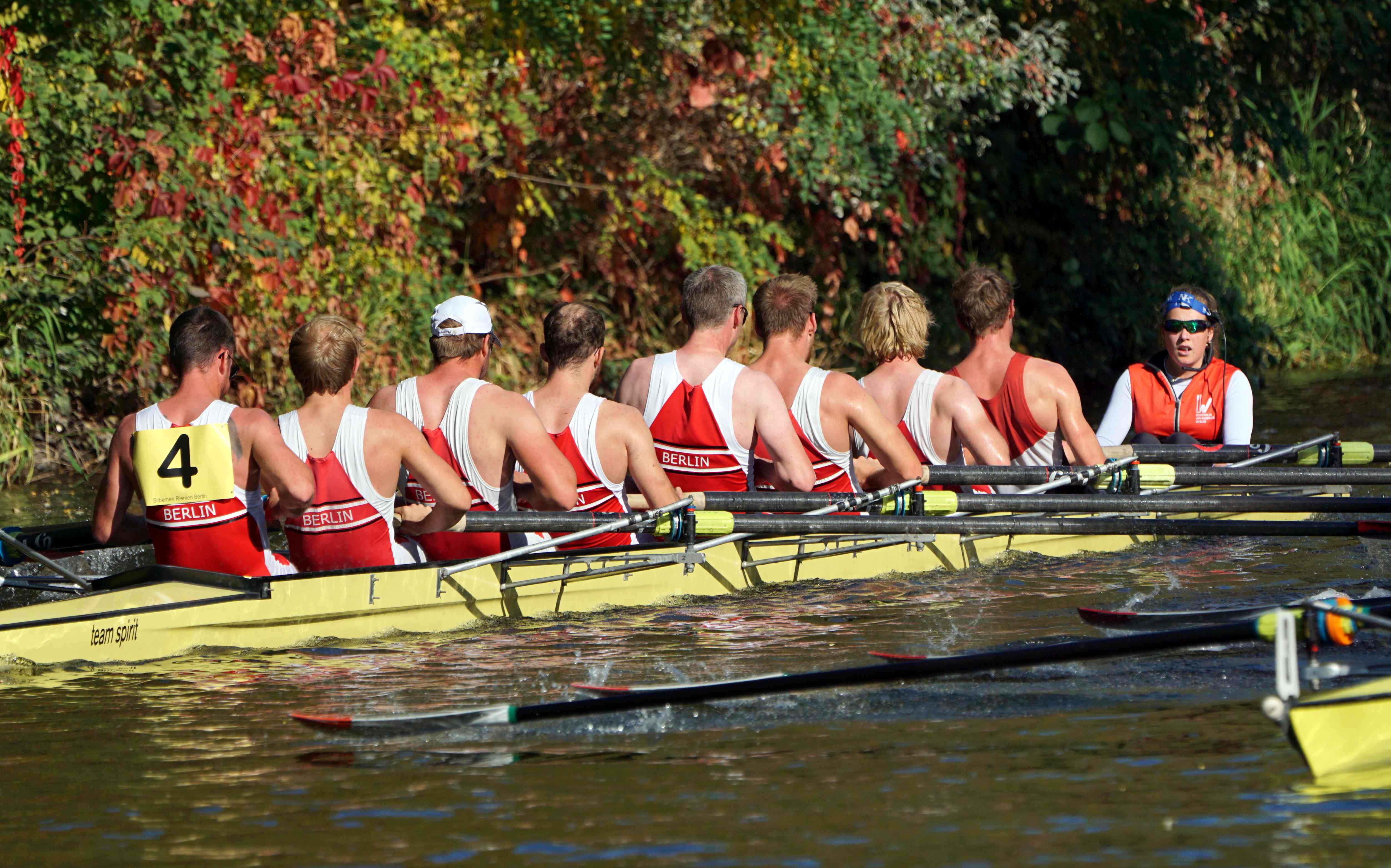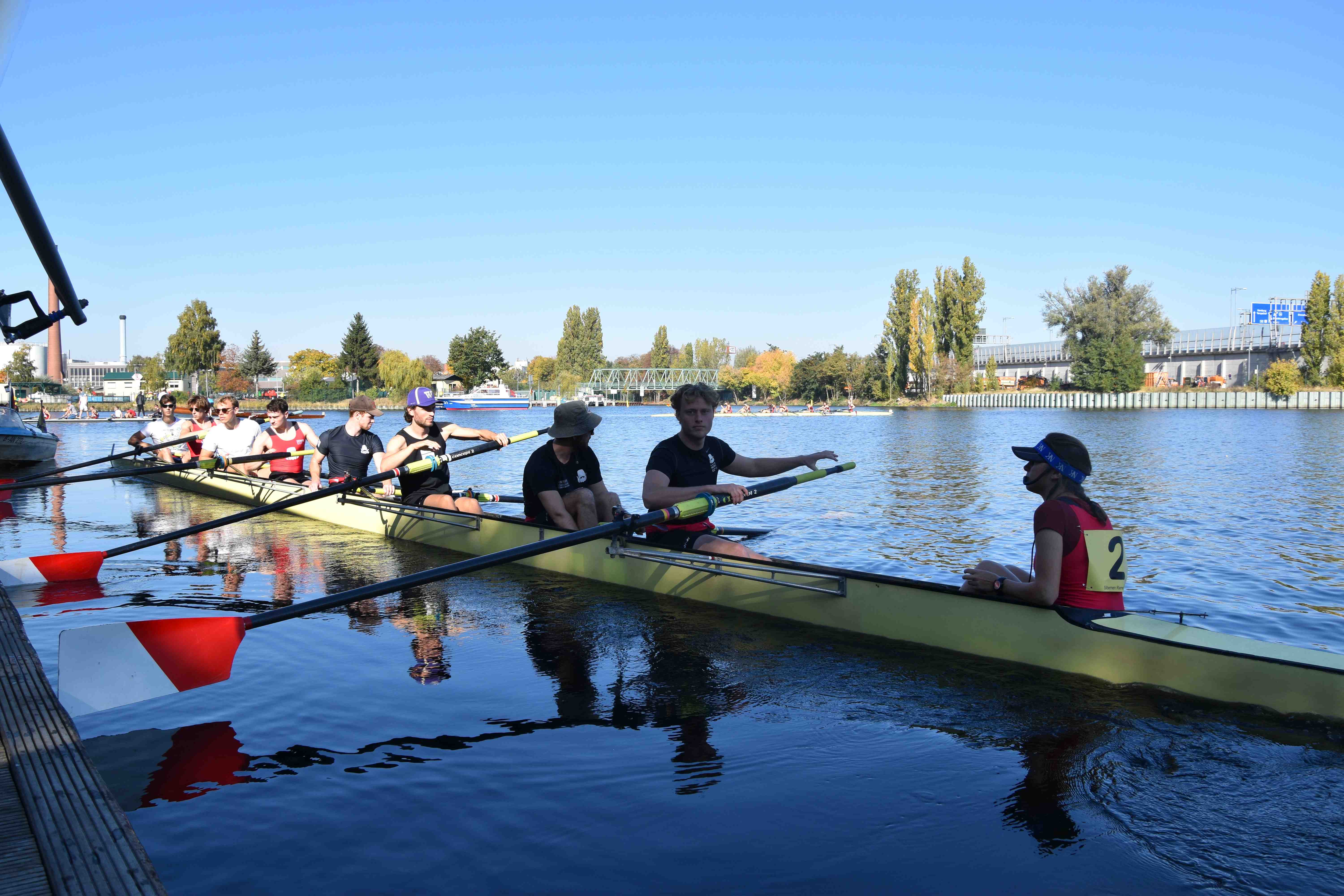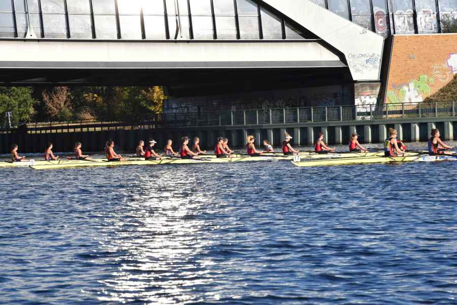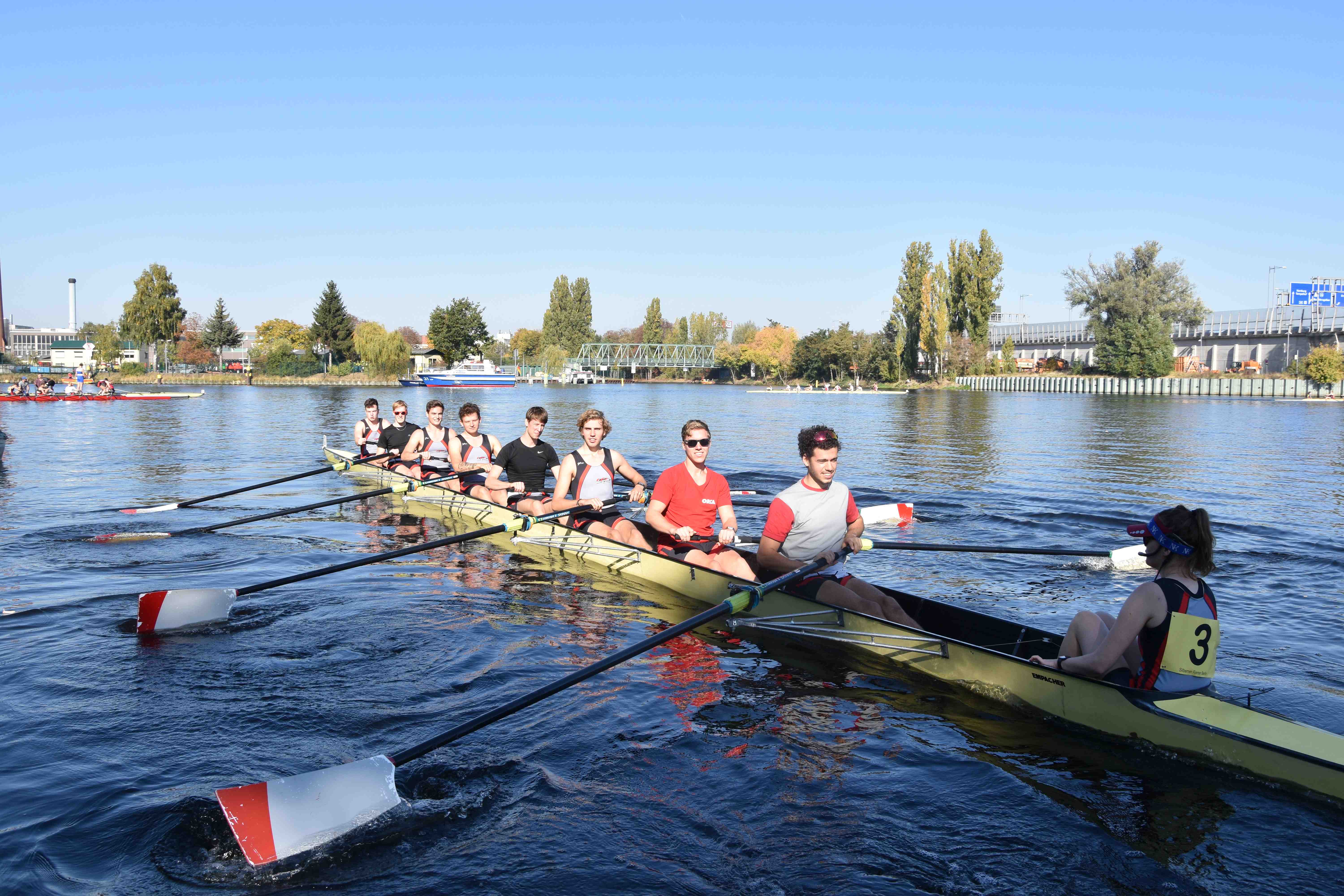Mit warm anziehen war auch am Samstag für die Ruderer nix. Bei supersonnigem Herbstwetter ging es zunächst um den Sieg auf der langen klassischen Distanz über 6,3 km. Dabei ging es von der Spreeinsel der Jugend entlang an der ehemaligen Berliner Mauer bis zum Britzer Hafen in Neukölln. An den Start gingen 22 Achtermannschaften, 7 Frauen Doppelvierer und 6 Gigdoppelvierer in der Club- und Inklussionsklasse. Dabei tankten Ruderer und Zuschauer zwischen Treptow und Neukölln mit viel nackter Haut die vermeintlich letzten Sonnenstrahlen im Oktober.