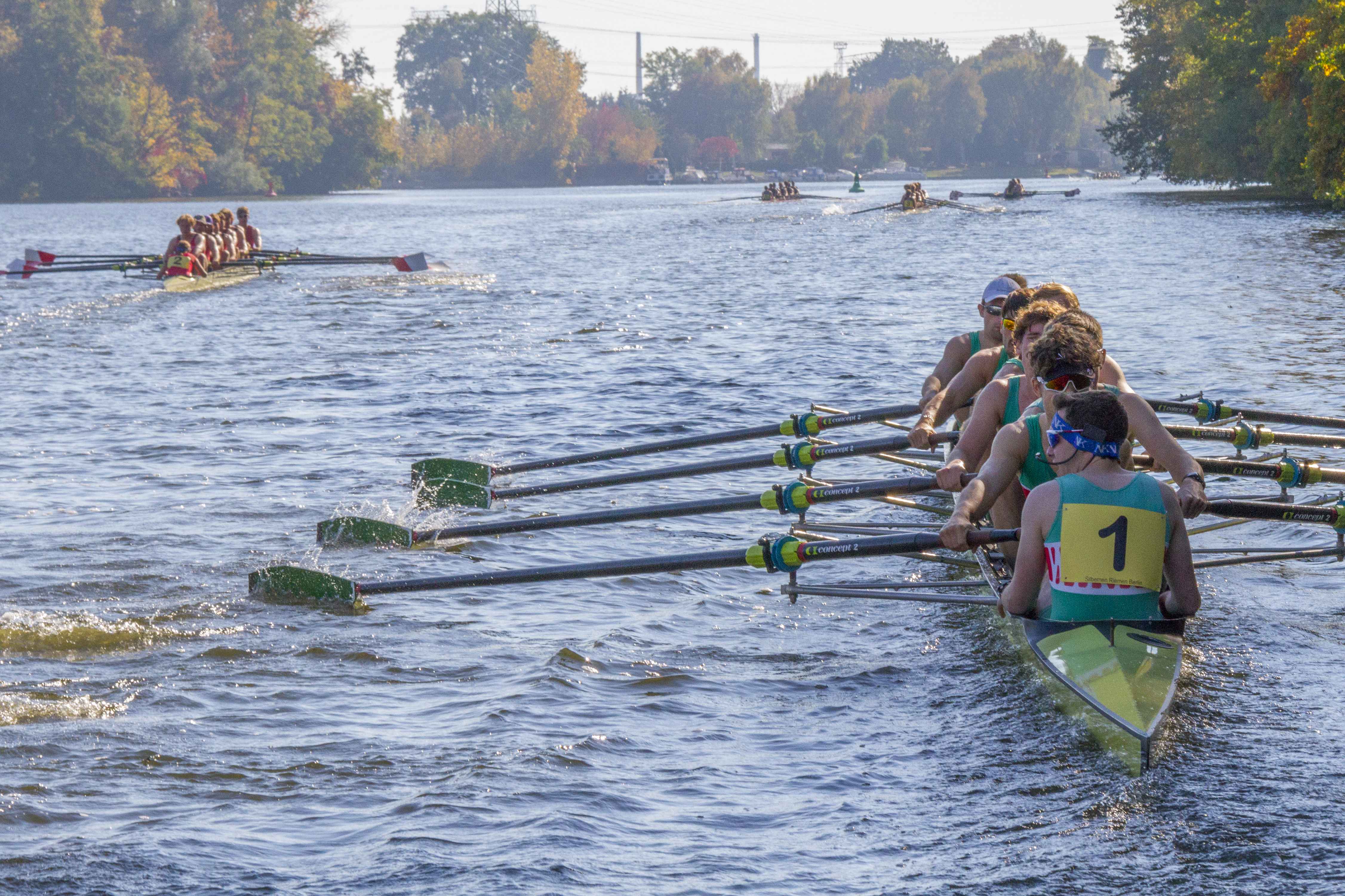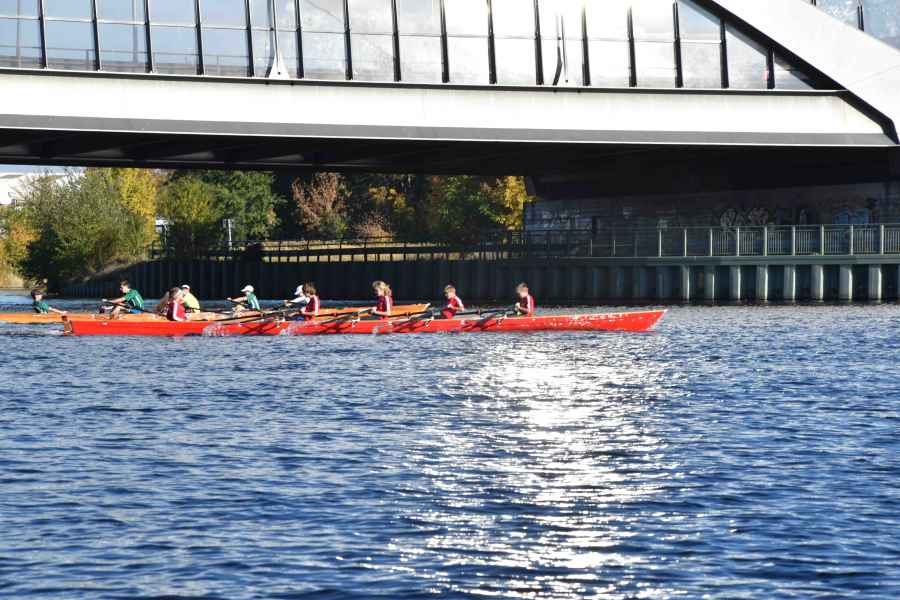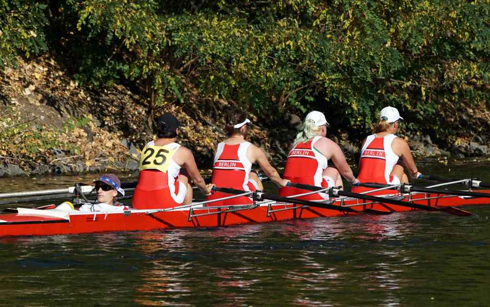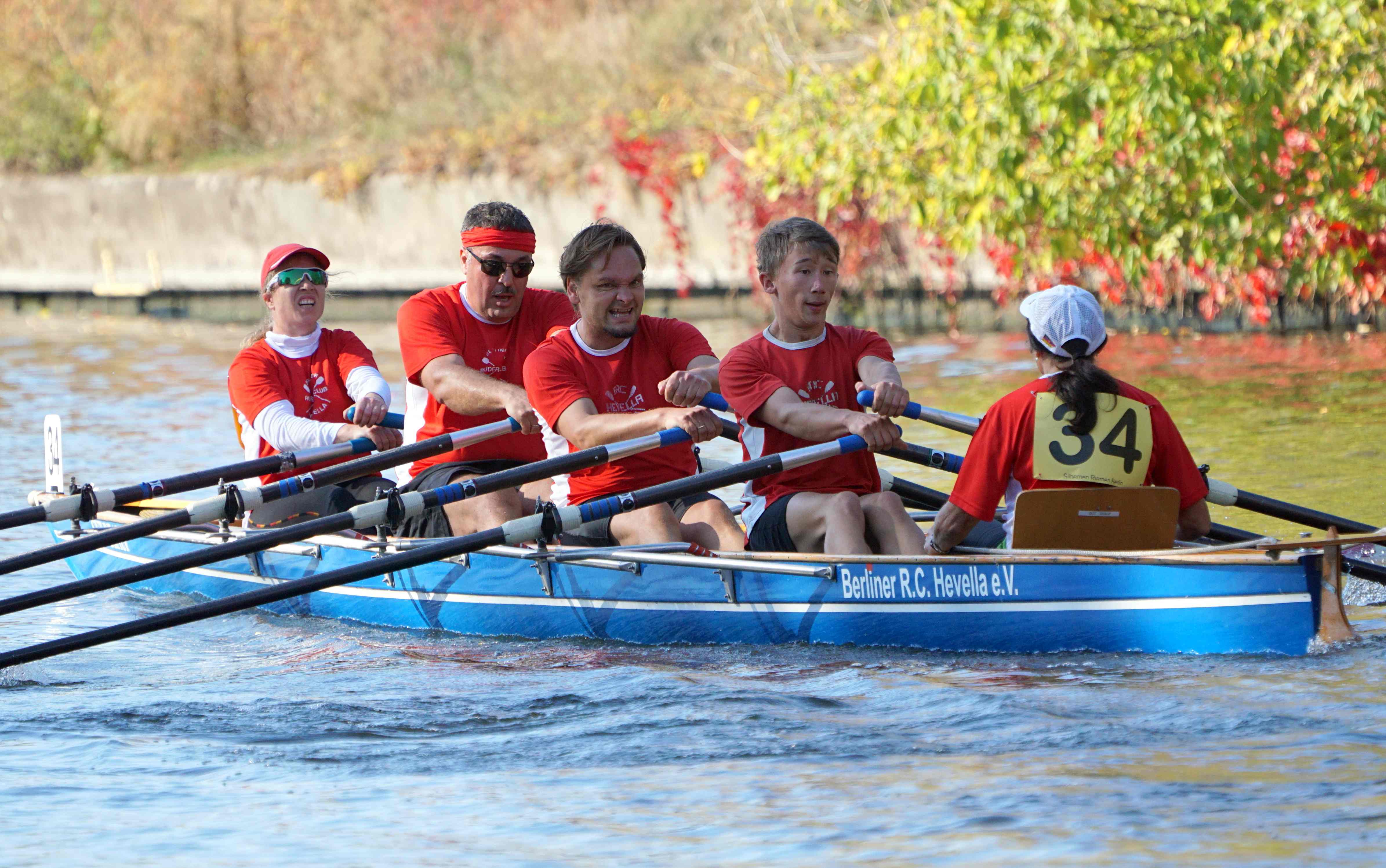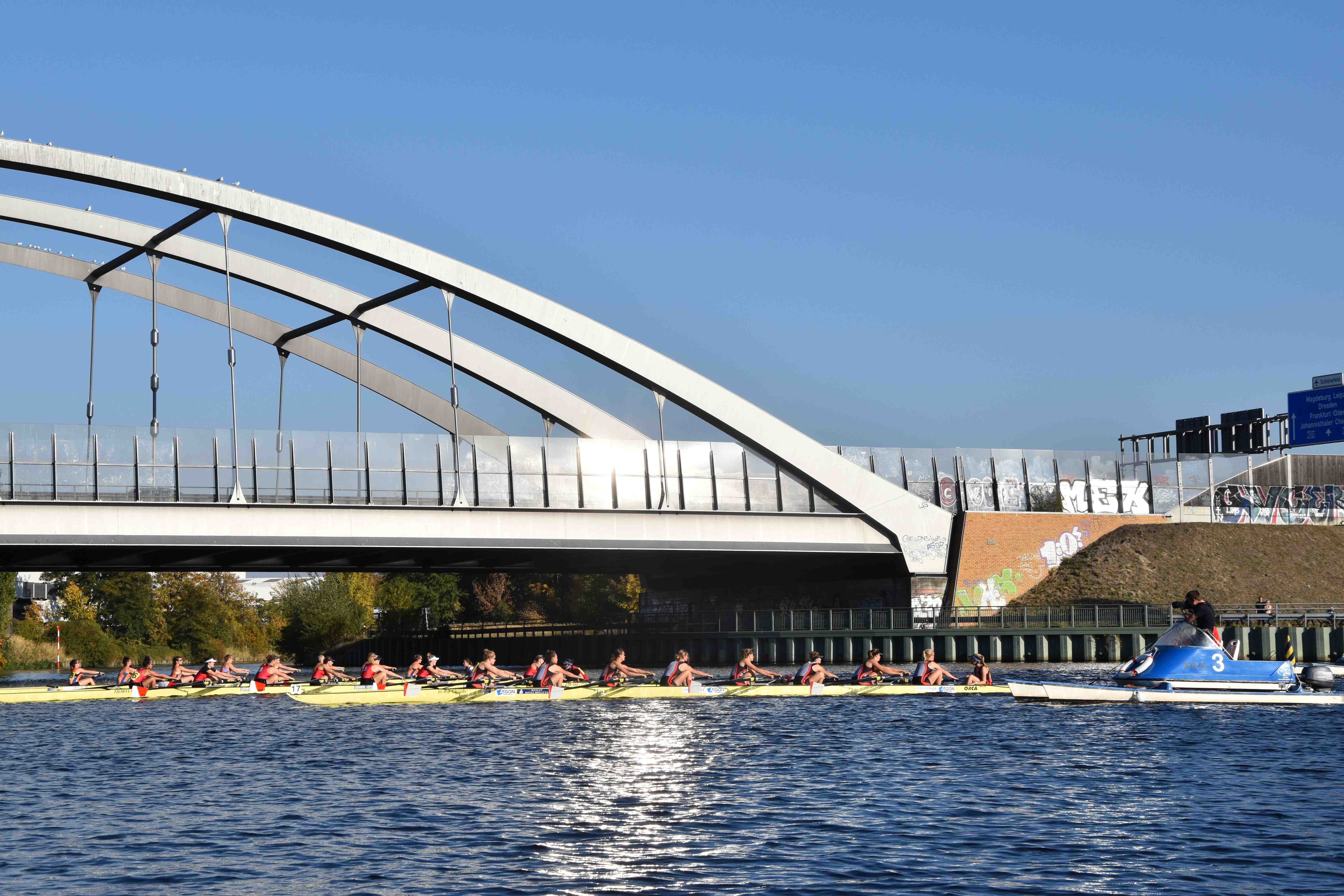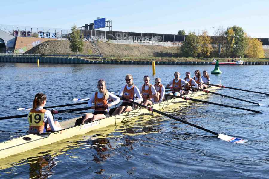 Mit warm anziehen war auch am Samstag für die Ruderer nix. Bei supersonnigem Herbstwetter ging es zunächst um den Sieg auf der langen klassischen Distanz über 6,3 km. Dabei ging es von der Spreeinsel der Jugend entlang an der ehemaligen Berliner Mauer bis zum Britzer Hafen in Neukölln. An den Start gingen 22 Achtermannschaften, 7 Frauen Doppelvierer und 6 Gigdoppelvierer in der Club- und Inklussionsklasse. Dabei tankten Ruderer und Zuschauer zwischen Treptow und Neukölln mit viel nackter Haut die vermeintlich letzten Sonnenstrahlen im Oktober.